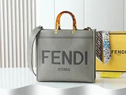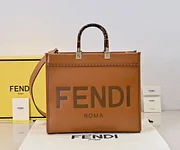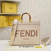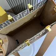 Sunshine medium-sized fabric tote bag, featuring a brown FF jacquard pattern and light brown leather ‘FENDI ROMA’ lettering, with rigid handles. It has a spacious lined interior compartment with light brown leather trim. Can be carried by hand using the double handles, and two interior hooks can be used to attach a shoulder strap. Size: 35-31-17.