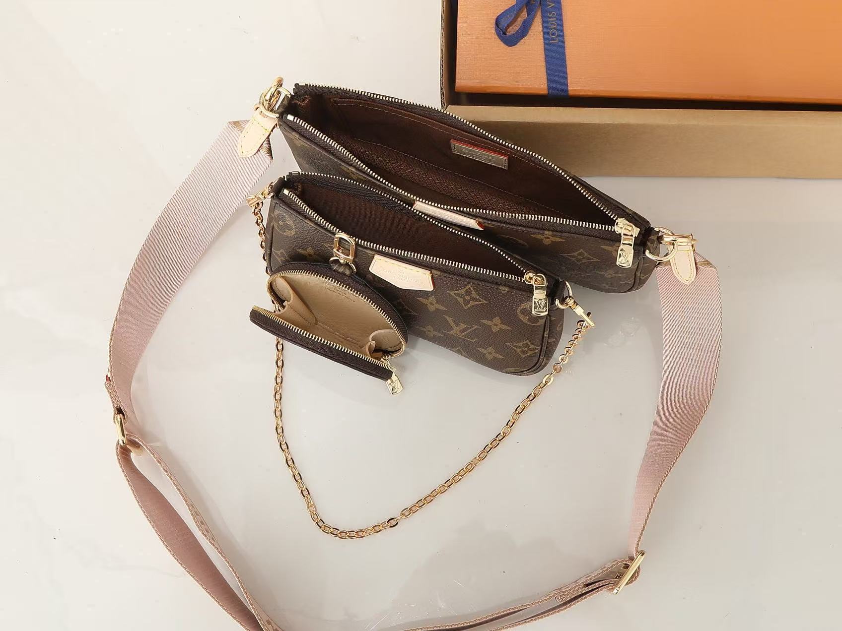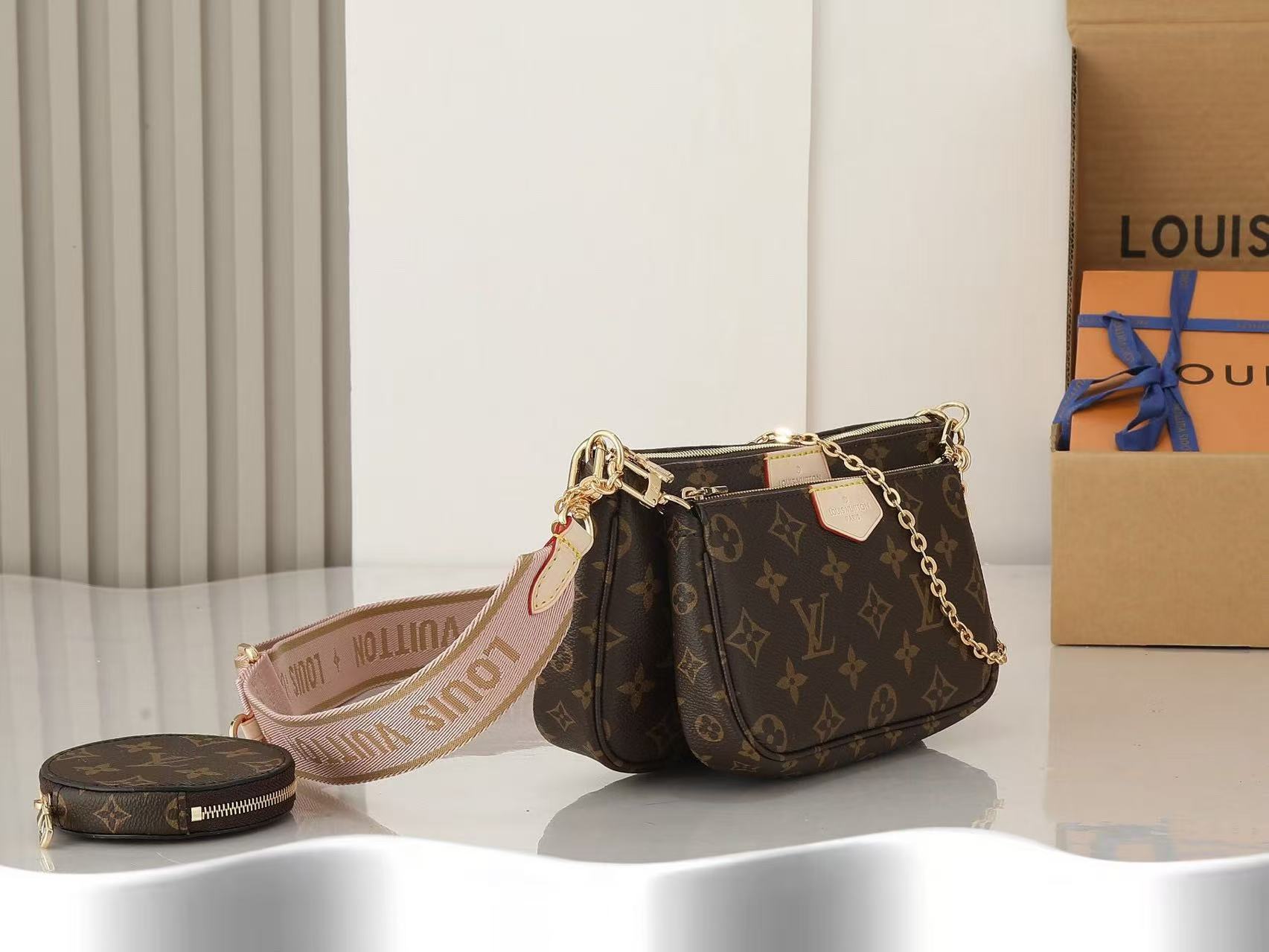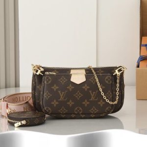 This premium set combines the Multi Pochette Accessoires bag, the Accessoires pouch, the Mini Pochette Accessoires pouch, and a coin purse into one. It is crafted from Monogram canvas featuring ingenious multi-pocket and compartment designs, with mini Monogram patterns embellishing both sides. Removable.