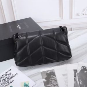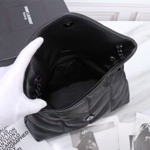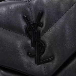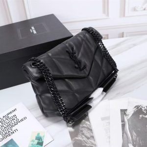 Cloud Bag 29cm. LOULOU PUFFER Small Quilted Lambskin Bag SAINT LAURENT Logo Bag, adorned with a YSL metal logo and a leather chain strap that can be folded to wear as a single shoulder strap. Item number 577476. Dimensions: 29.0 * 17.0 * 11.0 cm, 100% lambskin with silver brushed metal hardware, satin lining, magnetic snap closure, one inner zip pocket. Strap length: 52 cm, folded strap length: 28 cm.